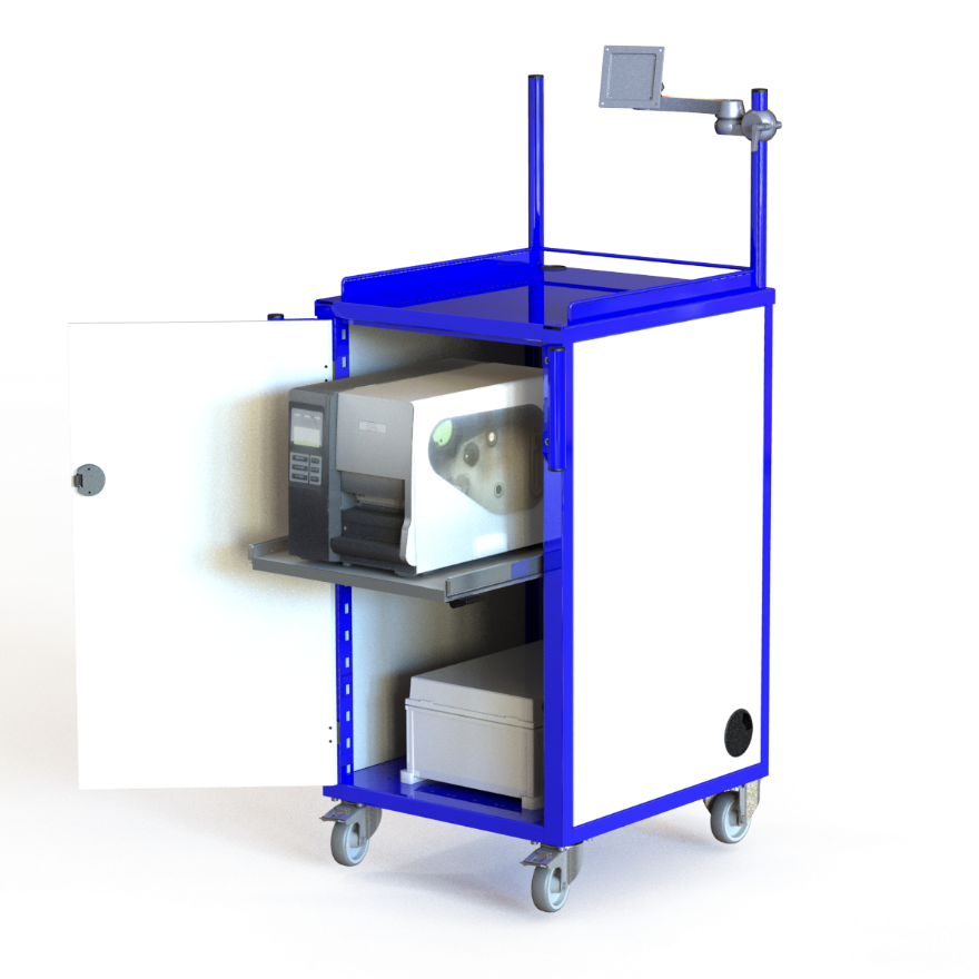 Capacité à recevoir plusieurs tablettes réglables en hauteur, pour imprimantes et/ou étiqueteuses.